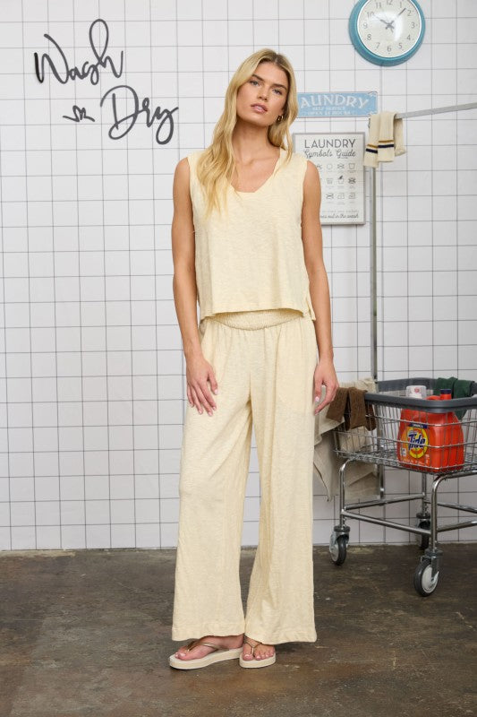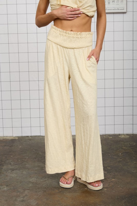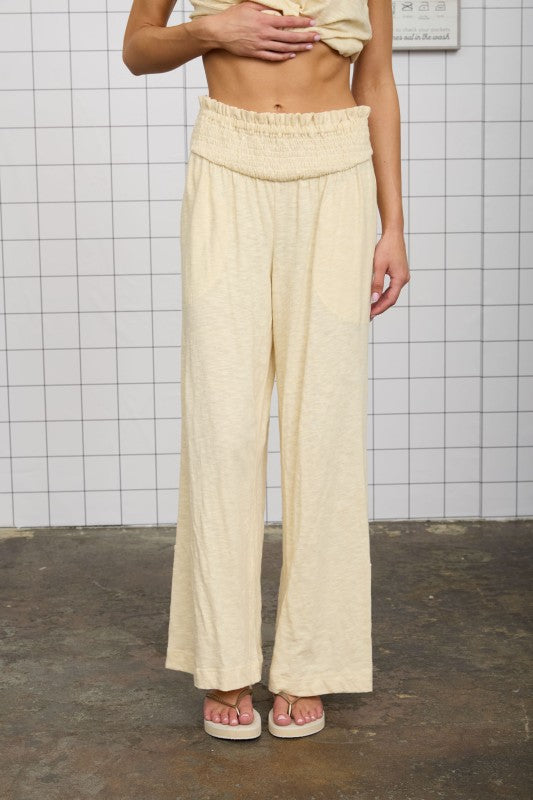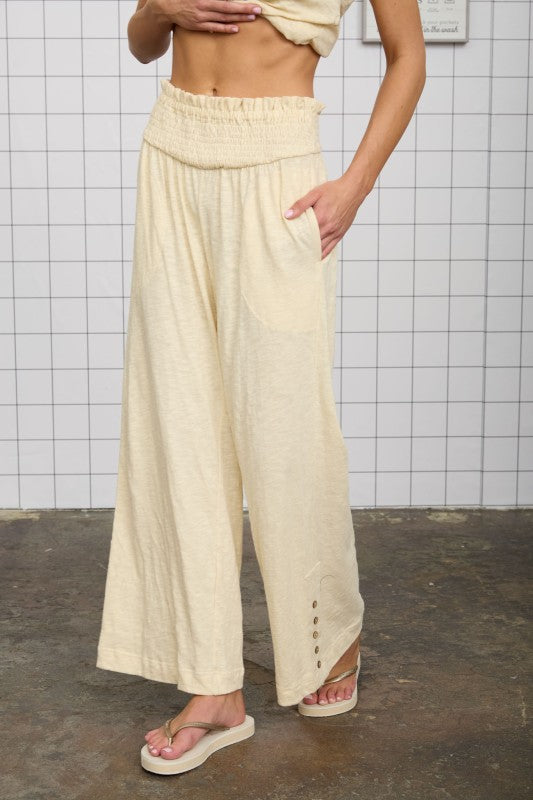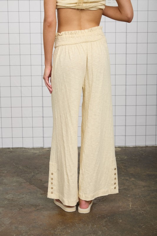 Effortless comfort meets timeless style with these Kasey Smocked Relaxed Pants. Make it a set with the matching Kasey Top. Crafted from soft cotton, they feature a flattering smocked waist that adjusts to your shape for a personalized fit. The heathered fabric adds subtle texture and the button detail at the hem adds a touch more detail. Perfect for travel or post pool day
