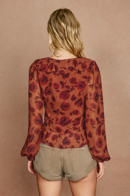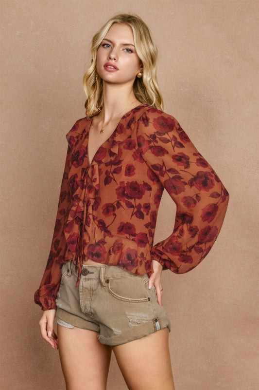 Twirl into spring with this charming airy floral chiffon blouse that's equal parts romantic and fun. Delicate ruffles frame the princess seams while spaghetti tie closures at the front let you adjust the fit just right.