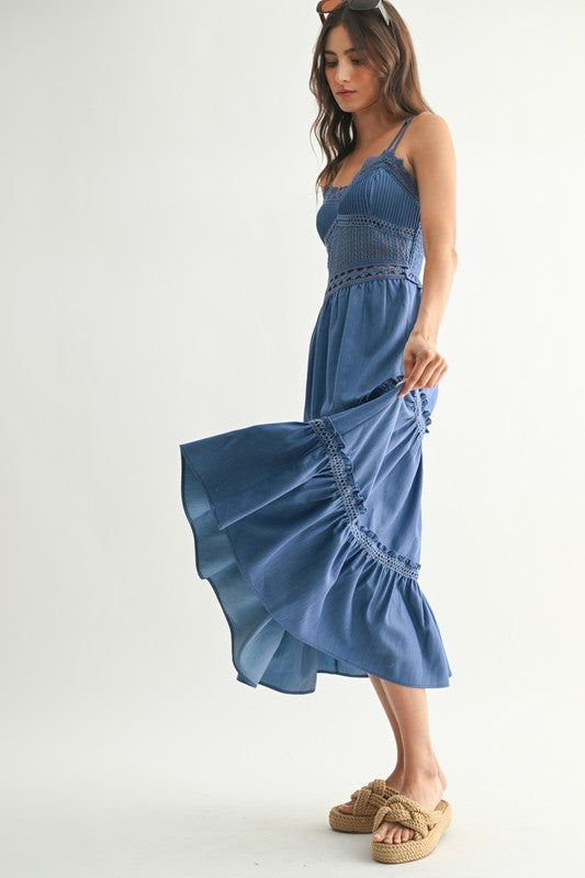 This elegant blue summer dress redefines casual sophistication with its intricate crochet detailing and tiered design. Whether you're heading to a garden party or a casual lunch, this dress ensures you look effortlessly stylish while staying comfortable in warmer weather. Detailed crochet stitching adds a touch of elegance and sophistication.