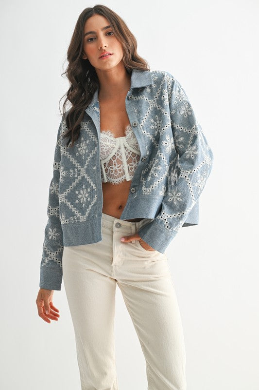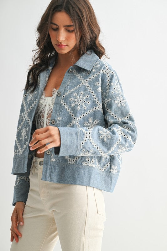 Elevate your wardrobe with this exquisite Embroidered Denim Jacket, a harmonious blend of classic style and contemporary elegance. Crafted for those who appreciate fine design and quality, this jacket promises to be a statement piece, embodying both sophistication and versatility.