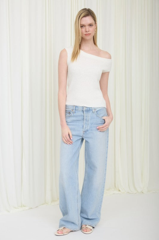 Relaxed neckline sweater top with one draped off shoulder