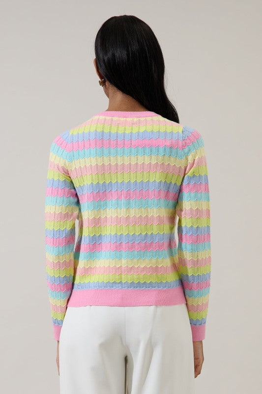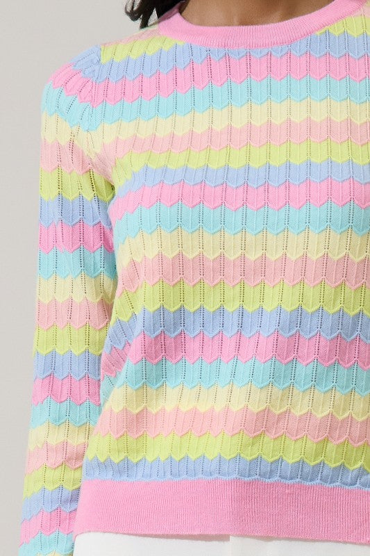 Make a cheerful statement with this rainbow-striped sweater, featuring a round neck for a cozy charm. The vibrant stripes bring instant joy, while the classic silhouette makes it endlessly versatile—wear it as a top or layered over your favorite basics for a fun, feel-good look