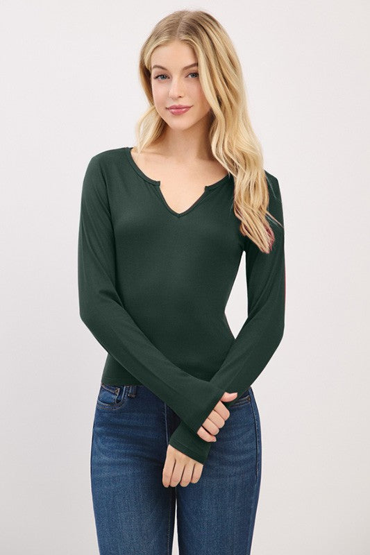 Long sleeve V-Neck with a front notched detail. It is fitted to perfect for a casual sexy look