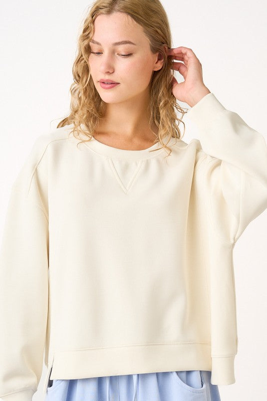 Cloud Pullover Sink into pure comfort with this ultra-luxe scuba knit pullover. Crafted from buttery-soft fabric that feels like a cloud against your skin, it's the kind of top that makes you never want to change. Perfect for lazy mornings, cozy evenings, or whenever you need to feel effortlessly put-together. The relaxed fit and premium knit construction deliver that coveted "I woke up like this" vibe—minus the actual effort. Your new favorite piece is here.