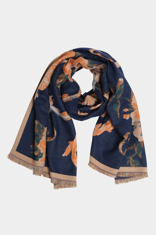 Size : 71" X 26" Material : 100% Viscose A soft scarf featuring an elegant floral print with a bordered edge and fringe finish.