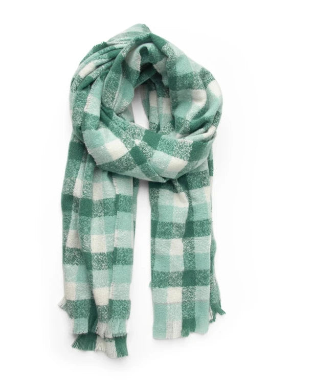Oversized style for wear as a scarf, wrap or throw -Buffalo plaid knit -Fringe finish