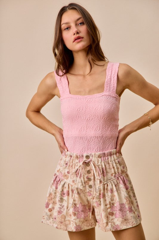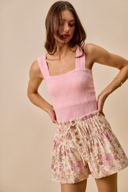 Elevate your warm-weather wardrobe with these charming floral print denim shorts. Featuring delicate pintuck detailingand a comfortable elastic waistband these are perfect for casual outings, weekend adventures, or relaxed styling. The vibrant floral pattern adds a feminine touch to classic denim, while the structured pintucks create visual interest and dimension.