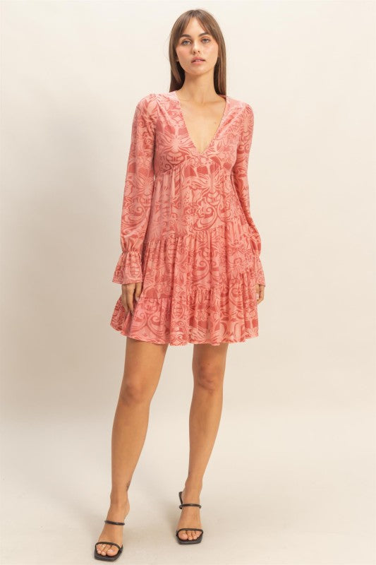 The dress showcases a romantic mini silhouette that's crafted from stretchy burnout velvet and boasts a V-neck and long sleeves with ruffled cuffs. Empire waistline drops down into a flowy skirt with asymmetric tiers. 59% polyester 30% nylon 11% spandex