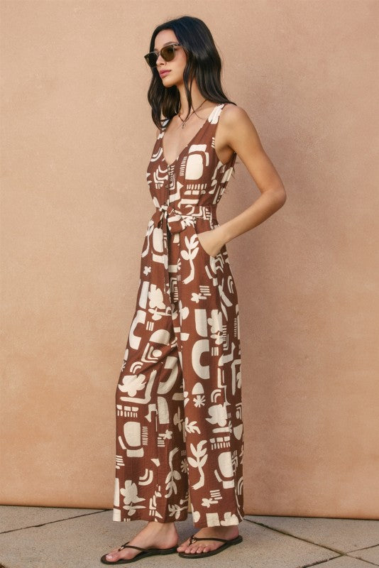 Conversational print rayon blend sleeveless jumpsuit with sash tie at waist.